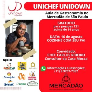 Marcando o mês dos pais, o Instituto UniDown em parceria com o Mercadão de São Paulo irá promover no dia 16 de agosto (sábado), das 13h às 15h, uma aula gratuita de gastronomia afetiva para pais de filhos com síndrome de Down. A aula será realizada no Espaço de Gastronomia e Cultura do Mercadão de São Paulo.
