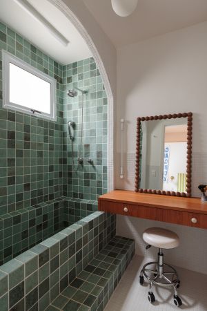 No banheiro social, destinado às visitas, o vermelho das paredes contrasta com o lavatório Clássica e bacia Elite no branco brilho e a torneira Basic e demais metais em preto fosco, criando um clima nostálgico e acolhedor. O box de tijolos de vidro permite privacidade e que a luz natural molde as tonalidades ao longo do dia, reforçando a sensação de leveza. Já no banheiro da suíte, pensado como um camarim, o chuveiro Master com ducha manual e a ampla bancada convergem a sensação de cuidado, enquanto tons neutros e o verde presente na área do box priorizam o foco na rotina pessoal.