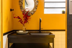 Composição de amarelo terroso com preto e branco criam o cenário atemporal para o lavabo – projeto Cambuci Arquitetos – Foto: Leila Viegas