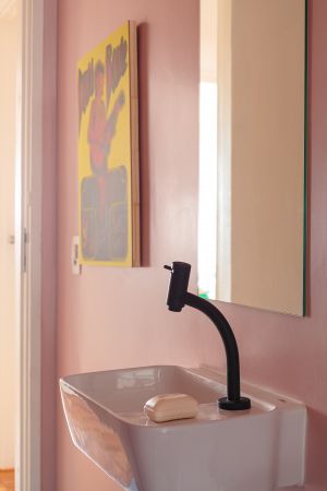 Já no banheiro social o rosa pastel ilumina o ambiente e cria uma sensação de suavidade. O lavatório suspenso Eco, combinado com a torneira Basic e os acessórios Flow em preto fosco, reforça uma estética contemporânea baseada no contraste entre formas leves e acabamentos marcantes. O resultado é um espaço lúdico, onde o uso do lavabo se transforma em uma pausa divertida e surpreendente.