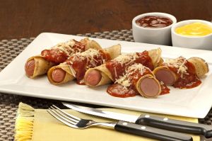 – Recheie os crepes com salsicha. Acomode num refratário médio, regue com molho de tomate, salpique o queijo parmesão e leve ao forno médio (180ºC) por 10 minutos para gratinar.