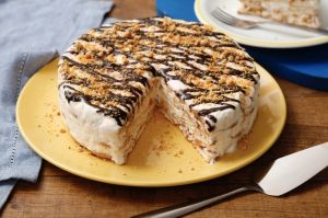 - 4.Em um refratário forrado de papel manteiga, posicione uma camada de Biscoito TOSTINES no fundo. Adicione o sorvete reservado e alise bem. Posicione outra camada de biscoitos por cima, cubra e leve para o freezer por cerca de 4 horas.