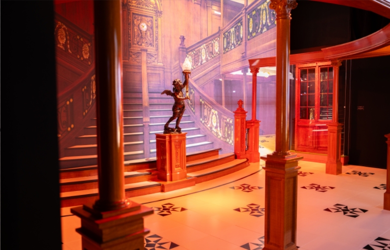 Alem disso, exposição reúne impressionantes itens ligados ao Titanic, como documentos de sua construção, bilhetes originais da White Star Line e objetos da tripulação. Destaques incluem reproduções cênicas, objetos autênticos, memorabilia e visões tridimensionais, como a escadaria central com sua característica angelical decorativa inspirada em Versalhes. Móveis refinados das cabines e vestuário da época ajudam a retratar a estética do navio e sua influência cultural. Também estão expostos objetos de cena do filme de James Cameron.