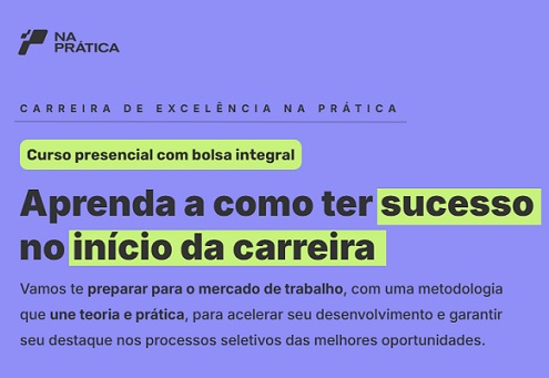 O curso gratuito “Carreira de Excelência: da universidade ao mercado de trabalho”, promovido pela plataforma “Na Prática”, está com inscrições abertas até o dia 31 de maio. A capacitação é composta por um encontro presencial e outro online, realizados em treze cidades do país. O módulo presencial será no dia 14 de junho (sábado), e o encontro online nacional está marcado para 19 de julho (sábado). Todos os selecionados receberão bolsa integral.
