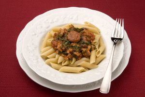 – Escorra a massa, acrescente o molho e o refogado de linguiça com couve e envolva tudo com a ajuda de dois garfos grandes.