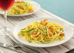 – Em uma panela grande, ferva 3 litros de água com o sal. Cozinhe a massa durante o tempo indicado na embalagem ou até que esteja “al dente”, ou seja, macia, porém resistente à mordida. Escorra imediatamente, misture delicadamente ao molho aquecido para que toda a massa fique envolvida e junte os camarões e a abobrinha. Polvilhe a cebolinha e sirva em seguida.