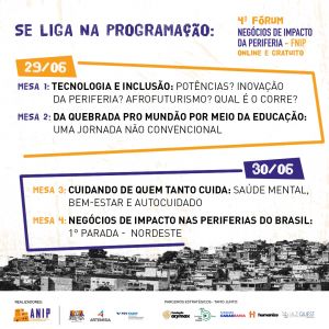 A despeito dos grandes desafios, o empreendedorismo de impacto social tem se fortalecido dentro das periferias do Brasil e mostrado a sua potência inovadora. Para debater essa mobilização transformadora e dar voz aos verdadeiros protagonistas desse movimento, a Articuladora de Negócios de Impacto da Periferia (ANIP) anuncia a quarta edição do Fórum de Negócios de Impacto da Periferia (FNIP), que acontecerá nos dias 29 e 30 de junho, on-line. Gratuito, o evento conta com as parcerias da Fundação Arymax, Fundação Tide Setubal, Fundação Casas Bahia, do Instituto Humanize e da Az Quest Investimentos. As inscrições estão abertas e podem ser feitas pelo site conteudo.articuladoranip.com/fnip2021.