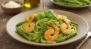 Fettuccine ao molho pesto com camarão e aspargo