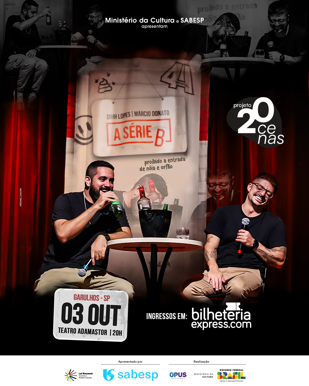 Dihh Lopes e Márcio Donato, dois dos maiores nomes do stand-up nacional e integrantes do fenômeno 4 Amigos, se unem em um espetáculo imperdível. O show “Série B” traz ao palco histórias hilárias de suas carreiras, episódios curiosos dos bastidores do grupo e, claro, muitas piadas sobre os parceiros Afonso Padilha e Thiago Ventura, autoproclamados representantes da “Série A”.